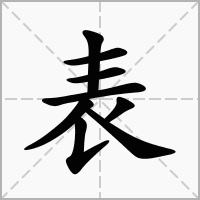 (会意。从毛,从衣,“毛”又兼作声符。小篆字形,衣字中间加个毛字。古人穿皮衣,毛朝外面,所以“表”从“毛”。本义:外衣)