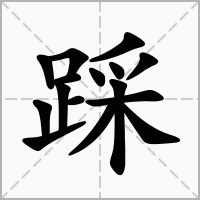 脚底接触地面或物体:当心~坏了庄稼。妹妹~在凳子上贴窗花。