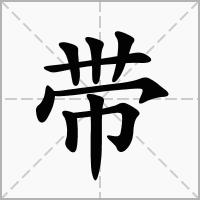 又如:带冕(大带和冠冕);带围(腰围,腰带);带钩(皮革腰带上的金属钩。形状一端曲直,另一端为圆钮以承钩。有动物形的,也有铸花纹的);带头(旧时衣袍外腰带上的扣头,常镶以金、玉等装饰物)