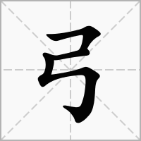 (象形。甲骨文字形,象弓形,有弓背和弓弦,后省去弓弦,只剩下弓背,隶变后变成现在的“弓”字。“弓”是汉字部首之一,从“弓”的字多与“弓箭”有关系。本义:射箭或打弹的器械)