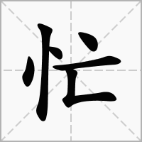 又如:急忙(心里着急,行动加快);忙丢丢(急急忙忙);忙不择价(匆忙出卖东西,就卖不到好价钱);忙迫(仓皇迫促;忙碌紧张);忙手忙脚(做事时心慌忙乱的样子);忙促(匆忙急促;忙碌而紧张);忙碌碌(匆忙急迫貌);忙忙迭迭(十分匆忙的样子)