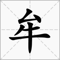 (会意。小篆字形。从牛,从厶。厶象气从口出。本义:牛叫声)