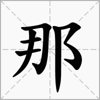 (形声。小篆字形,从邑,冄(rǎn)声。邑与地名或行政区域有关。后省作“那”。①本义:国名。《说文》:“西夷国。”本读 nuó。②指示代词。特指某个人、某个时间、某个地方或某个事物。不一定是远指之词,如“那件事你我心里都清楚。”)
