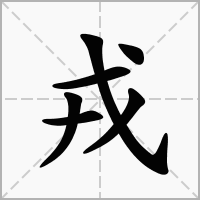 (会意。从戈,从十。“戈”是兵器,“十”是铠甲的“甲”。本义:古代兵器的总称。弓、殳、矛、戈、戟为古代五戎)